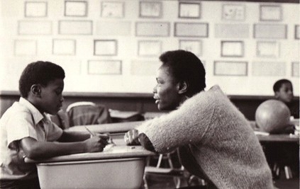 with her former husband, not the African American one, the white one. Another sweet image is of Pat sitting in an elementary school classroom looking intently at the face of a young Black boy.