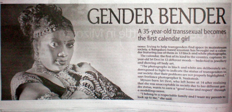 Today, I came across this article and photograph in a popular gossip newspaper. The article is extraordinary in its matter-of-fact coverage. Hijras (Eunuchs) are common if not accepted in Indian culture however the subject of this article clearly identifies herself as transgender, out and proud.